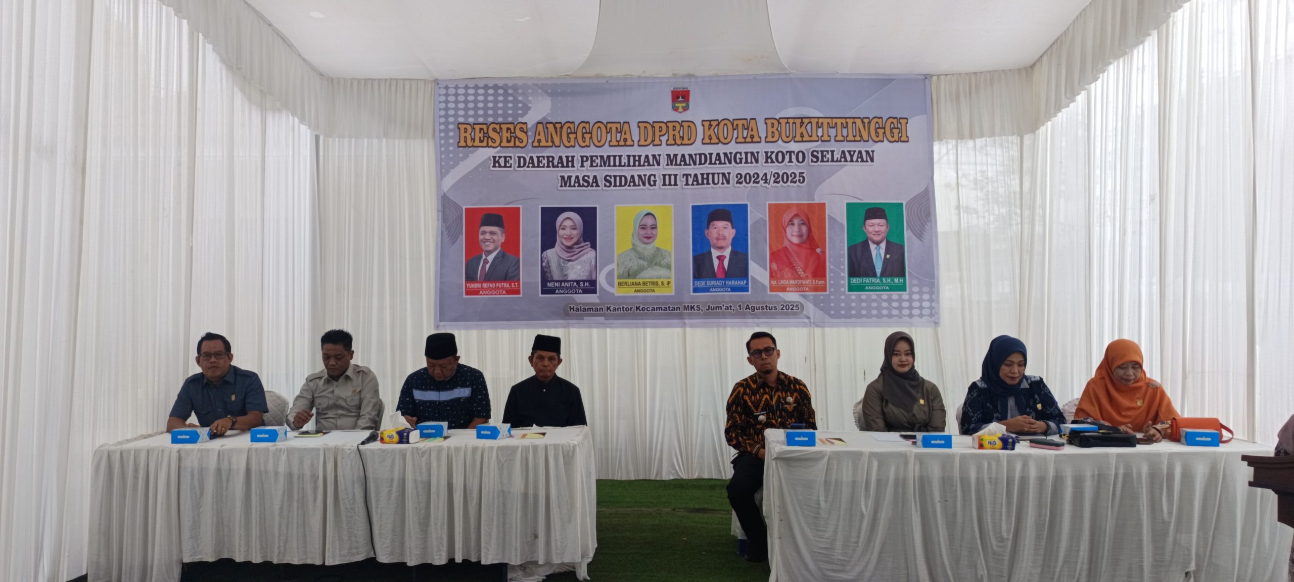Anggot dewan dari Dapil MKS, yang melaksanakan rses kelompok ini, Yundri Refno Putra (Gerindra), Neni Anita (Nasdem), Berliana Betris (Golkar), Dede Suryadi Harahap (PAN), Linda Wardiyanti (PKS) dan Dedi Fatria (PPP). Sementara, eakil rakyat dari dapil MKS lainnya, melaksanakan reses secara perorangan.